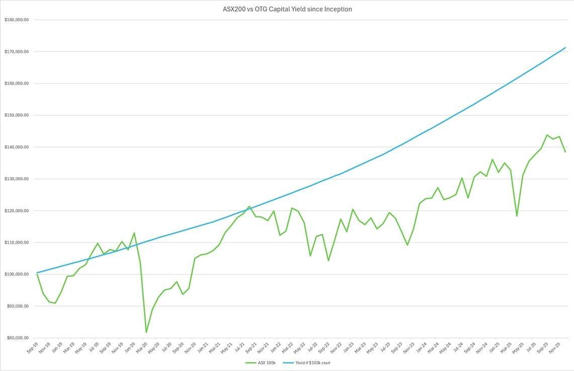 While this graph compares the ASX200 and OTG Capital, it does not mean the risk weighted returns are created equal. Equities in the ASX200 are highly liquid and a redeemable return can be priced daily. Investments in OTG Capital are illiquid and the yield is reviewed on a monthly basis. Our comparison simply intends to demonstrate our past performance against a commonly known and used benchmark.